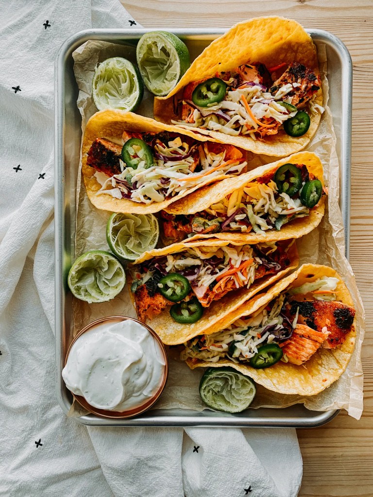 | To serve, divide the salmon evenly among 8 tortillas, top with the slaw, drizzle with crema, and sprinkle with cilantro. | 2 teaspoons grated lime zest |