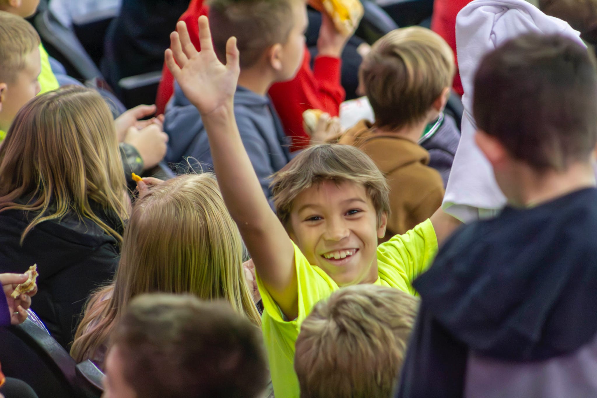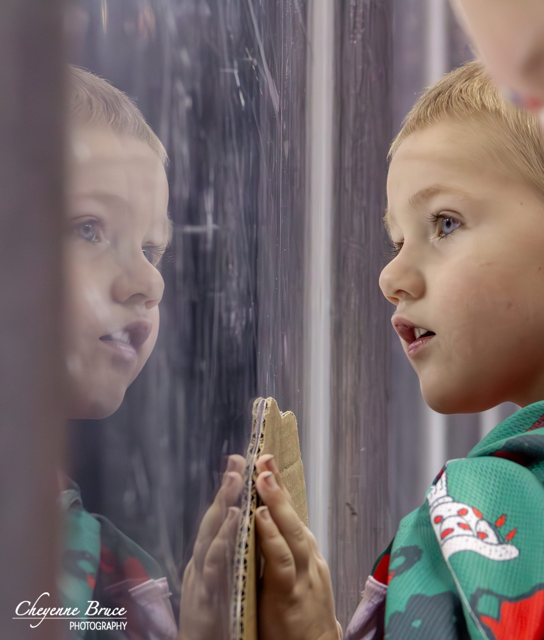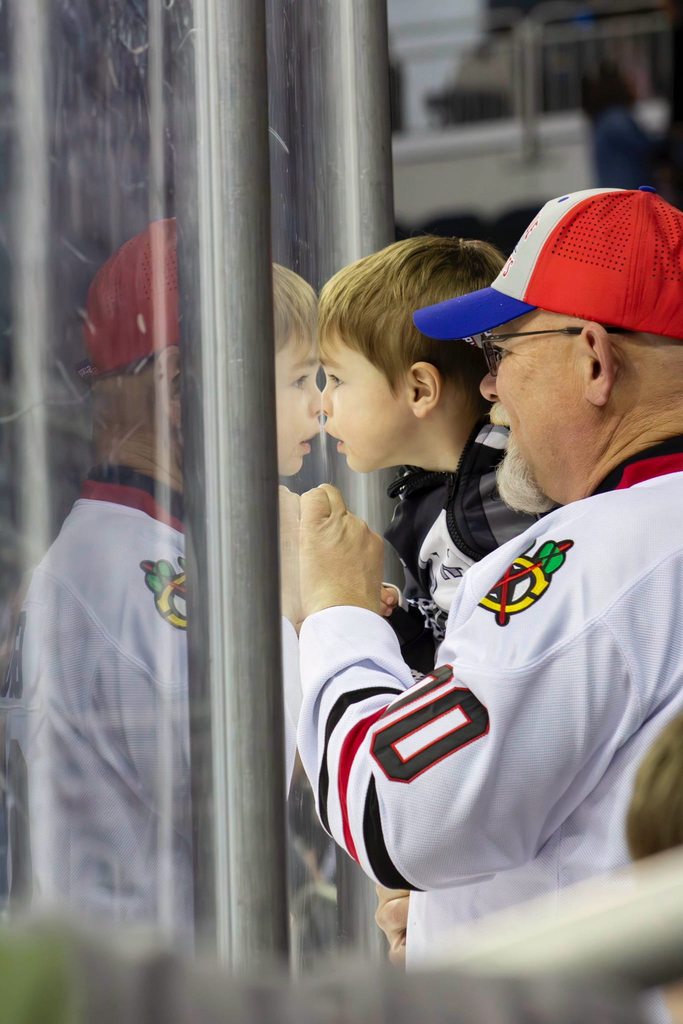 - A grandpa and his young grandson at his first hockey game with his little face against the glass